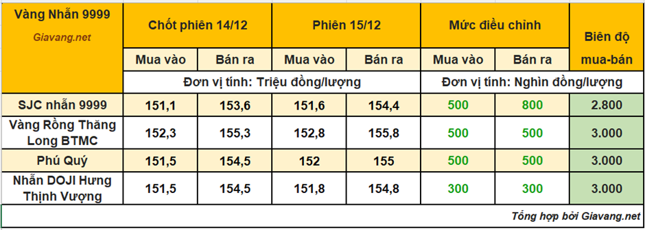 Trong khi đó, Nhẫn Phú Quý niêm yết giao dịch mua – bán ở mức 152 – 155 triệu đồng/lượng, giá mua và giá bán đều tăng 500 nghìn đồng mỗi lượng so với ngày 14/12.