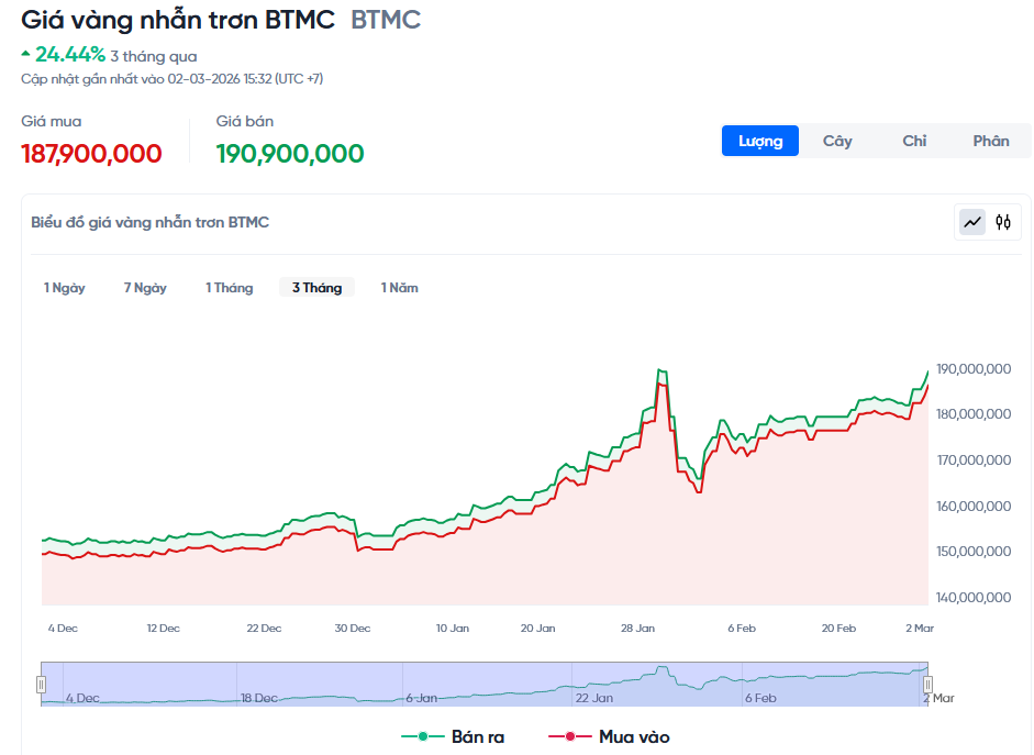 Cập nhật thời điểm 15h20 ngày 2/3/2026, vàng nhẫn SJC niêm yết giao dịch mua – bán ở mức 186,4 – 189,4 triệu đồng/lượng, giá mua tăng 2,6 triệu và giá bán tăng 2,6 triệu so với giá chốt phiên ngày hôm qua.
