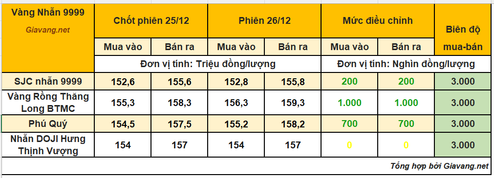 Trong khi đó, Nhẫn Phú Quý niêm yết giao dịch mua – bán ở mức 155,2 – 158,2 triệu đồng/lượng, giá mua và giá bán đều tăng 700 nghìn so với ngày 25/12.