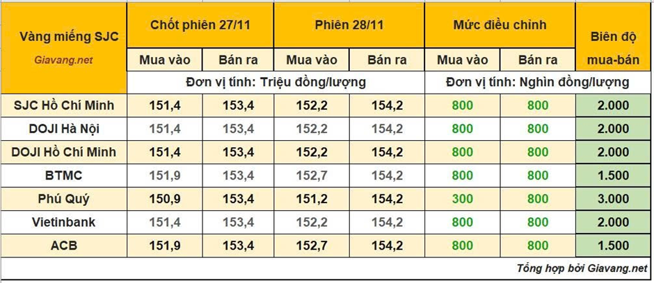 Trong khi đó, Nhẫn Phú Quý niêm yết giao dịch mua – bán ở mức 150 – 153 triệu đồng/lượng, giá mua và giá bán cùng tăng thêm 300 nghìn đồng mỗi lượng so với ngày 27/11.