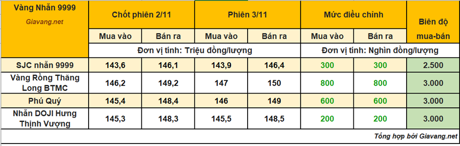 Trong khi đó, Nhẫn Phú Quý niêm yết giao dịch mua – bán ở mức 146 – 149 triệu đồng/lượng, giá mua và giá bán cùng tăng 600 nghìn đồng mỗi lượng so với ngày 2/11.