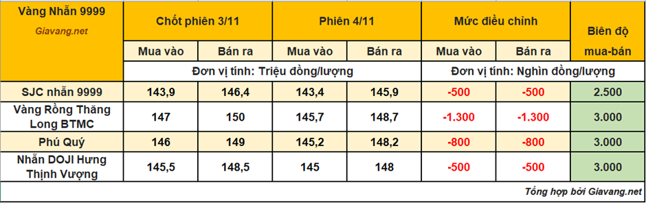 Trong khi đó, Nhẫn Phú Quý niêm yết giao dịch mua – bán ở mức 145,2 – 148,2 triệu đồng/lượng, giá mua và giá bán cùng giảm 800 nghìn đồng mỗi lượng so với ngày 3/11.