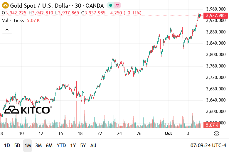 Sau khi tăng 3% trong tuần trước, giá vàng khởi động tuần mới bằng cú tăng vượt $3900 trong phiên Á, leo dốc không ngừng để tạo đỉnh mới tại $3950/oz.