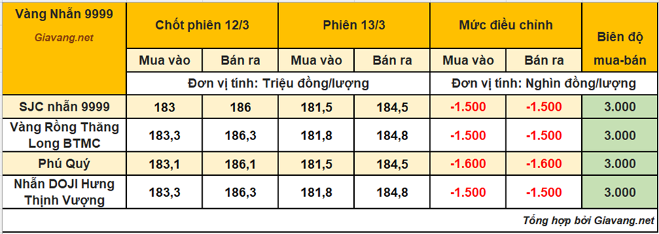 Trong khi đó, Nhẫn Phú Quý niêm yết giao dịch mua – bán ở mức 181,5 – 184,5 triệu đồng/lượng, giá mua và giá bán cùng giảm 1,6 triệu so với ngày 12/3.