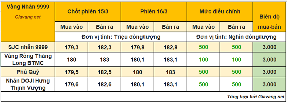 Trong khi đó, Nhẫn Phú Quý niêm yết giao dịch mua – bán ở mức 180 – 18ư triệu đồng/lượng, giá mua và giá bán cùng tăng 500 nghìn so với ngày 15/3.