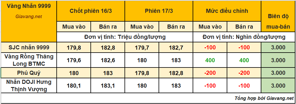 Nhẫn Bảo Tín Minh Châu, niêm yết giao dịch mua – bán ở mức 180 – 183 triệu đồng/lượng, giá mua tăng 400 nghìn và giá bán tăng 400 nghìn so với cuối ngày 16/3.