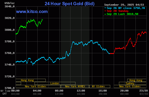 Trên thị trường quốc tế, giá vàng khởi động tuần mới bằng đà tăng sốc, lên mức kỉ lục mới là $3820/oz.
