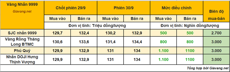 Trong khi đó, Nhẫn Phú Quý niêm yết giao dịch mua – bán ở mức 131 – 134 triệu đồng/lượng, giá mua và giá bán tăng thêm 1,1 triệu mỗi lượng so với ngày 29/9.