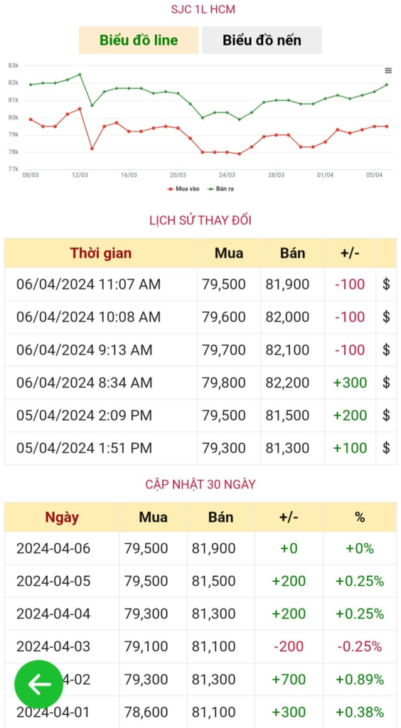 Kết thúc ngày cuối tuần 6/4, giá vàng miếng SJC Hồ Chí Minh neo giao dịch mua – bán tại mốc 79,50 – 81,90 triệu đồng/lượng, tăng 1 triệu đồng chiều mua và 900.000 đồng chiều bán so với giá mở cửa phiên đầu tuần 1/4.