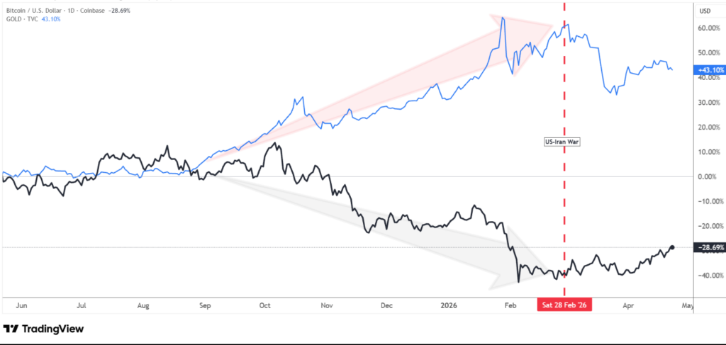Dù cùng là tài sản thay thế, nhưng Vàng và Bitcoin hiện đang chuyển động theo các chất xúc tác khác nhau: