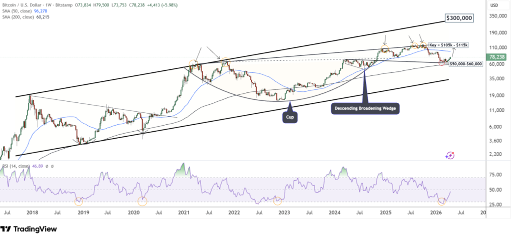 - Vùng đệm an toàn: Mức giá $50,000 – $60,000 trở thành hỗ trợ dài hạn cực kỳ vững chắc (trùng với đường SMA 200 tuần).