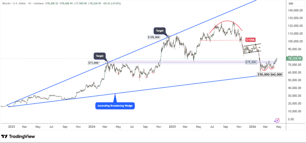 - Mô hình dài hạn: Cấu trúc Cốc và tay cầm từ 2021-2024 dự báo mục tiêu quay lại mốc $120,000.