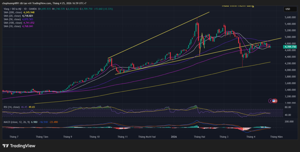 Vàng đang nằm trong một “vùng nguy hiểm” về mặt kỹ thuật. Lộ trình giảm giá vẫn được bảo toàn chừng nào giá còn nằm dưới cụm kháng cự $4720 – $4862.