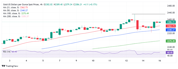 Theo quan sát trên biểu đồ 4h, giá Vàng đang khá thoải mái trên Đường trung bình động đơn giản 21 (SMA) ở mức $2363 sau khi xác nhận đây là vùng kháng cự vào phiên Mỹ hôm qua.