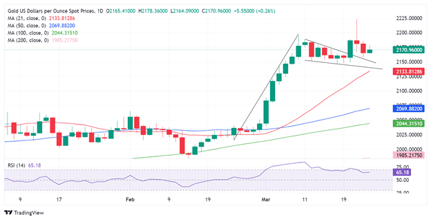 - Ngắn hạn: Tăng, vàng nằm cao trên mức trung bình động 20 ngày tại $2138.