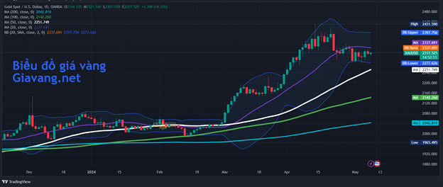 - Ngắn hạn: Giảm, giá vàng nằm dưới đường trung bình động 20 ngày tại $2337. Đường MA 20 ngày tiếp tục có xu hướng dốc xuống cho thấy lực tăng ngắn hạn yếu đi.