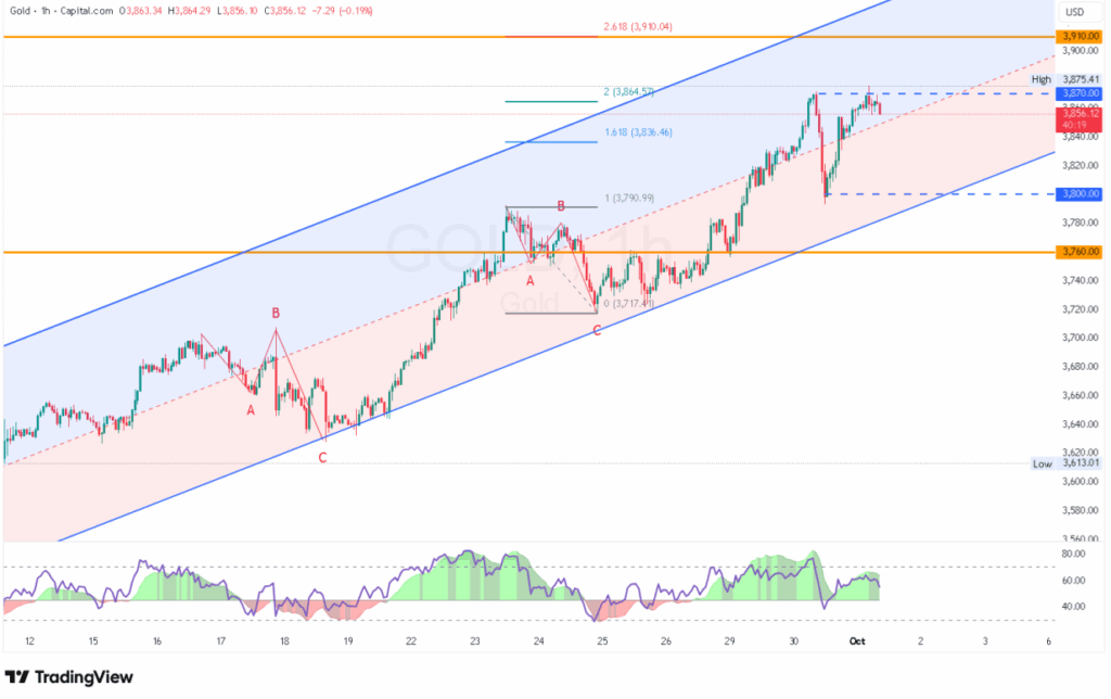 - Hiện giá đang tích lũy ngay dưới ngưỡng kháng cự $3.870/oz, trong khi chỉ số RSI hạ nhiệt khỏi vùng quá mua – cho thấy khả năng xuất hiện nhịp nghỉ hoặc điều chỉnh nhẹ.