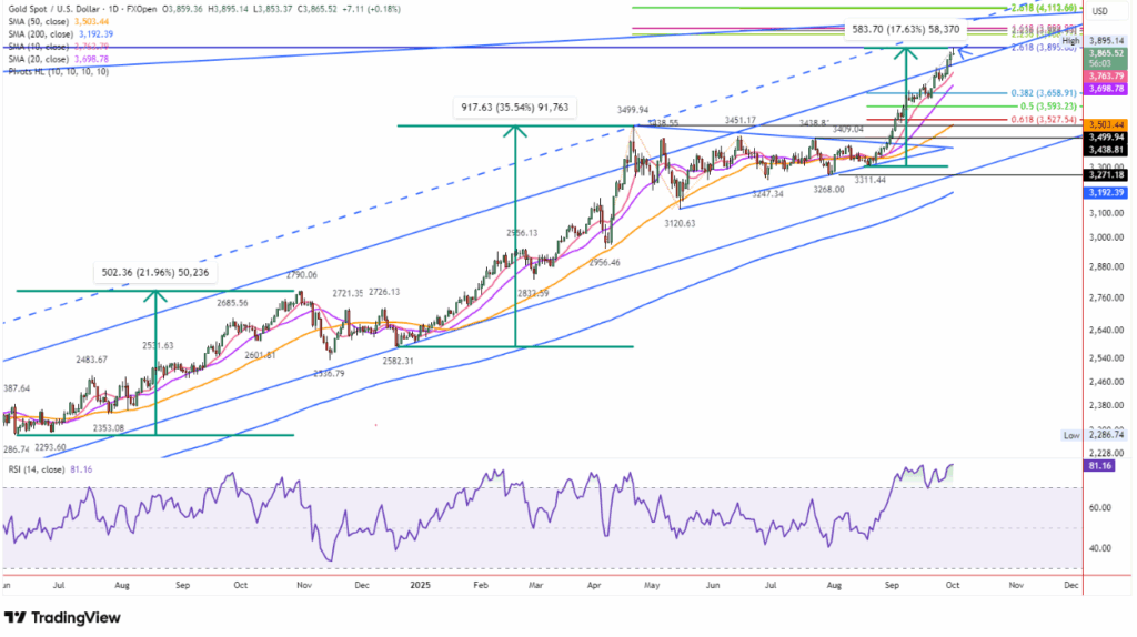 Giá vàng (XAU/USD) chạm mốc kỷ lục $3.895 trong phiên giao dịch thứ Tư trước khi chịu áp lực bán mạnh, hình thành nến shooting star – tín hiệu cho khả năng điều chỉnh ngắn hạn. Tuy vậy, xu hướng dài hạn vẫn duy trì tích cực với mục tiêu cao hơn.
