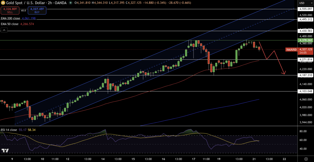 Việc giá không giữ được trên 4.378 USD cho thấy dấu hiệu suy yếu ngắn hạn, RSI quanh 55 thể hiện đà tăng đang tạm chững.