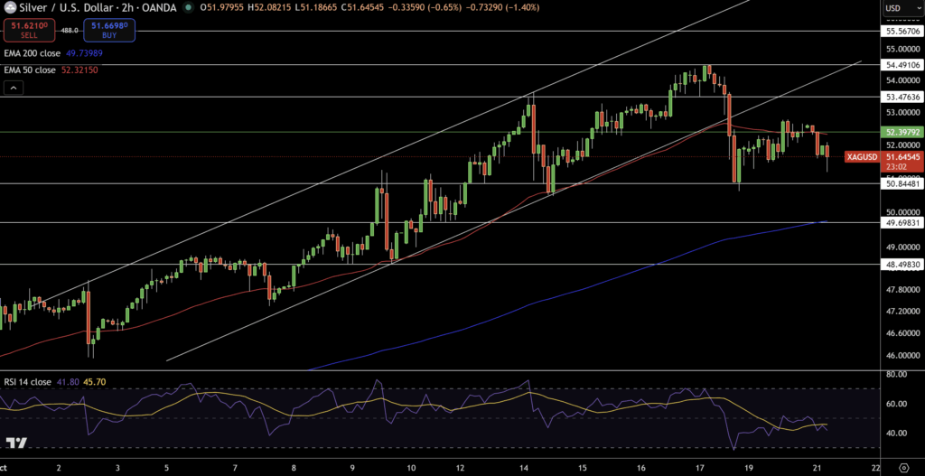 Bạc: Xu hướng giảm nhẹ, có thể kiểm tra vùng hỗ trợ 50,8 – 49,7 USD trước khi ổn định trở lại.