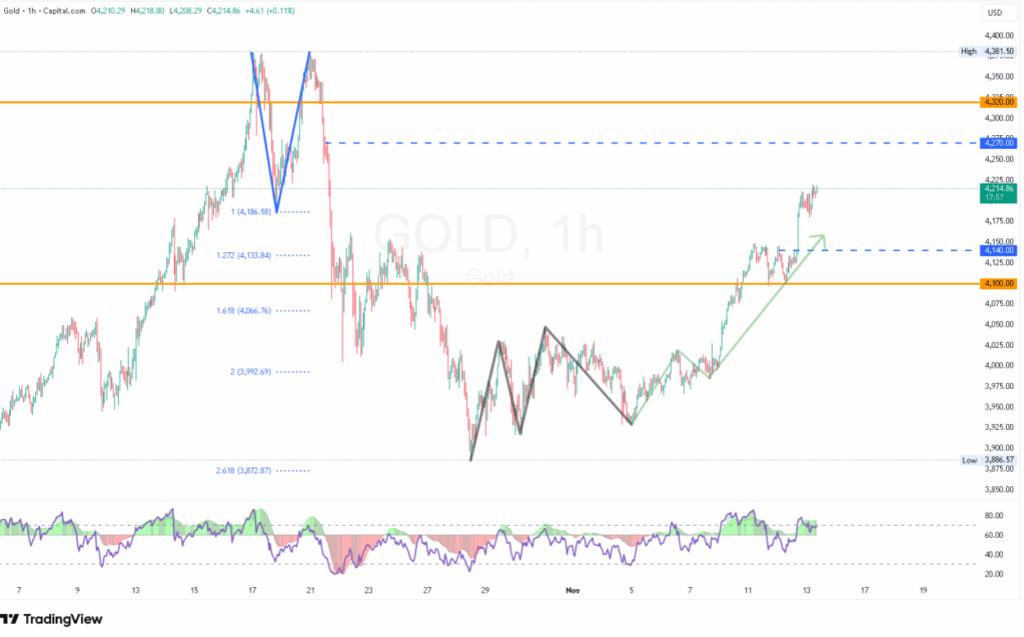 Trên phương diện kỹ thuật, giá vàng đang tích lũy trên vùng $4.200, sau khi ghi nhận chuỗi phục hồi mạnh mẽ đầu tuần. Động lượng tăng vẫn chiếm ưu thế, với mục tiêu kháng cự kế tiếp tại $4.270, trùng vùng phản ứng trước đó. Ở chiều ngược lại, hỗ trợ gần nhất nằm tại $4.140, xa hơn là $4.100 – vùng được xem là điểm tựa quan trọng để duy trì xu hướng tăng.