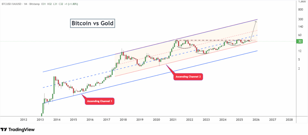Tỷ lệ Bitcoin/vàng đã duy trì xu hướng tăng dài hạn từ năm 2013 đến nay. Mẫu hình vai-đầu-vai ngược trên biểu đồ (2021–2025) với đường viền cổ quanh mốc 40 đang gợi mở khả năng bứt phá. Nếu vượt qua, mục tiêu tiếp theo có thể là vùng 100 – đồng nghĩa với việc Bitcoin nhiều khả năng sẽ vượt trội so với vàng trong giai đoạn tới.