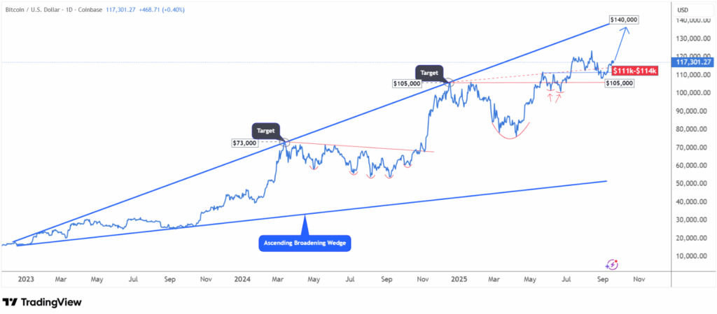 - BTC hiện dao động trong mẫu hình nêm mở rộng hướng lên từ 2023.