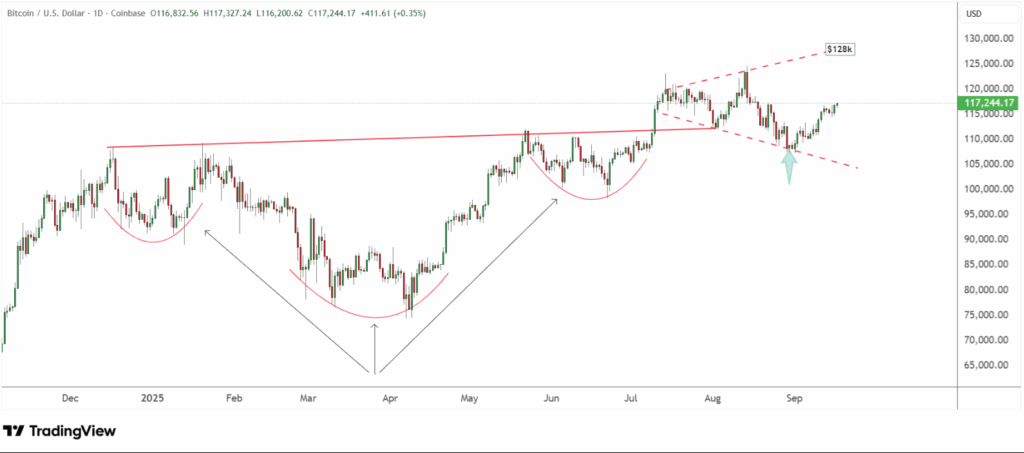- Các mô hình kỹ thuật cho thấy BTC đang hướng về vùng $128,000; nếu bứt phá thành công, mục tiêu tiếp theo sẽ là $140,000.