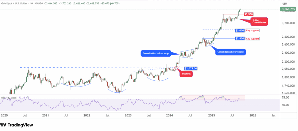 - Xu hướng tăng từ 2021 vẫn còn nguyên, với vùng $3500–$3600 trở thành hỗ trợ then chốt.