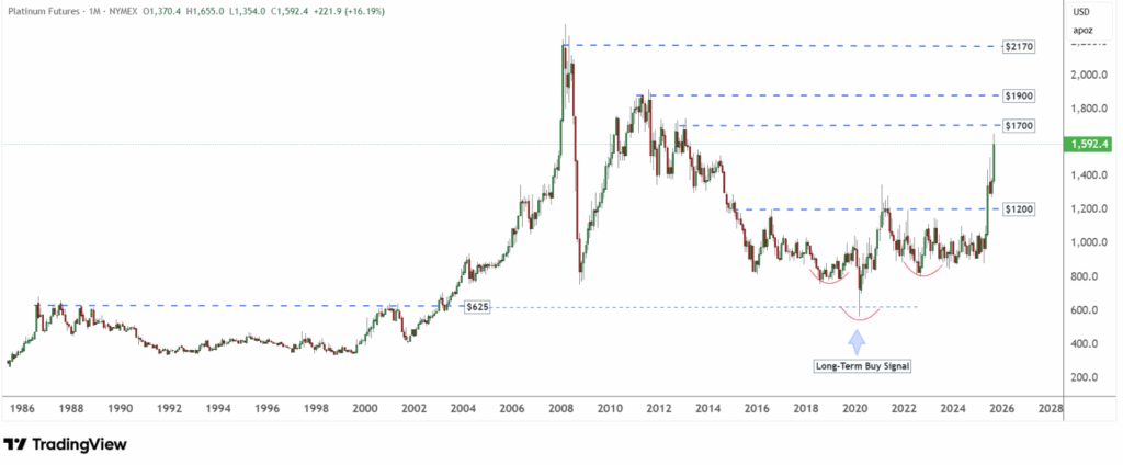 - Phân tích kỹ thuật: Platinum đã thoát khỏi mô hình “vai đầu vai ngược”, mở ra mục tiêu giá mới tại $1.900 – $2.170/oz nếu vượt ngưỡng kháng cự $1.700.