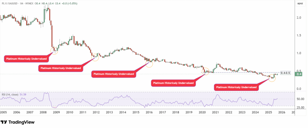 Tỷ lệ platinum/vàng và platinum/palladium cho thấy bạch kim đang ở vùng định giá thấp lịch sử. Nếu dòng vốn từ vàng và bạc luân chuyển sang nhóm kim loại quý khác, platinum có khả năng vượt trội hơn palladium trong trung hạn.