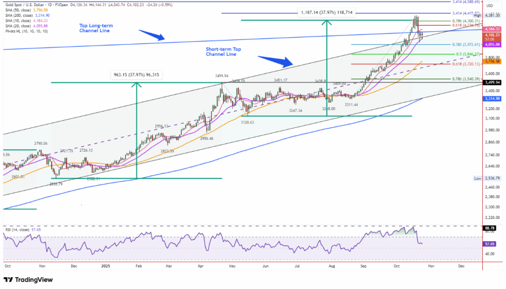 Cây nến ngày hôm nay mang hình dạng bullish hammer (nến búa tăng) — dấu hiệu cho thấy đà giảm đã chững lại, tương tự như mô hình xuất hiện hôm thứ Tư. Tuy nhiên, để khôi phục lại xu thế tăng mạnh, vàng cần bứt phá rõ ràng trên $4.185/oz, tương ứng vùng kháng cự của đường trung bình động 10 ngày.