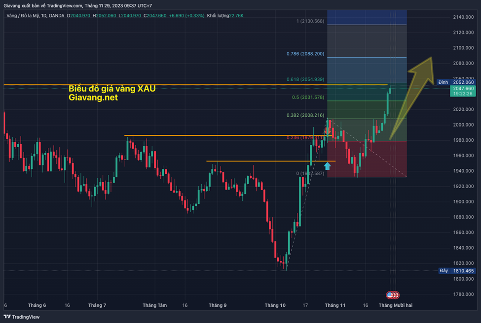 - Giá vàng đang giao dịch ở mức cao chưa từng thấy trong bảy tháng qua, vượt qua ngưỡng $2,040, tăng gần 13% so với mức thấp của tháng Mười là gần $1,810.