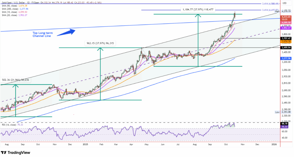 (GVNET) Giá vàng (XAU/USD) vừa có phiên giao dịch đầy biến động, khi chạm đỉnh lịch sử mới tại 4.379 USD/oz trước khi chịu áp lực bán mạnh, kéo giá rơi xuống dưới 4.200 USD và hướng về ngưỡng hỗ trợ quan trọng 4.098 USD – mức trùng với đường trung bình động 10 ngày.