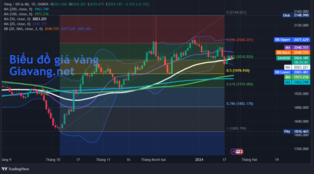 - Xu hướng ngắn hạn: Vàng trong xu hướng giảm ngắn hạn khi các quan chức Fed chưa ủng hộ hạ lãi suất. Giá vàng nằm dưới trung bình động 20 ngày tại $2040.