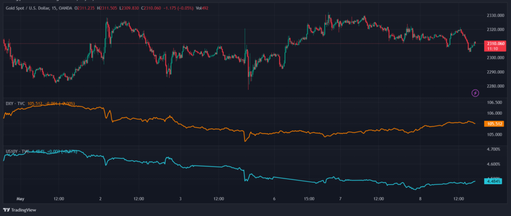 Chỉ số DXY đang tăng vượt 105,5 sau khi giảm xuống thấp nhất 3 tuần gần đây tren 104. Đồng thời, Lợi suất Trái phiếu chính phủ Mỹ kì hạn 10 năm cũng tăng sau đà giảm vừa qua. Vàng giữ được mốc $2300 cho thấy lực mua ở vùng thấp là khá tốt.