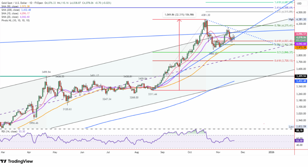 Từ khi thiết lập đáy cao mới tại 3.998 USD, vàng hầu như không thể duy trì bất kỳ nhịp tăng nào. Mỗi lần bật lên đều gặp lực cung mạnh, khiến cấu trúc xu hướng trở nên mong manh và kém tin cậy cho phe mua.