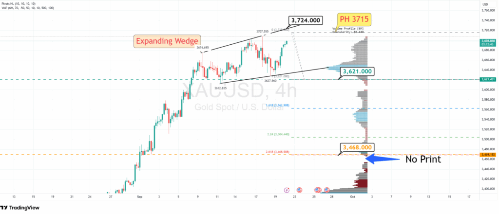 Giá vàng (XAUUSD) tiếp tục dao động mạnh trong vùng gần đỉnh lịch sử $3.707,5, hình thành mô hình Expanding Wedge (Nêm mở rộng) trên biểu đồ intraday. Diễn biến này cho thấy thị trường đang trong giai đoạn biến động giằng co, tiềm ẩn khả năng điều chỉnh giảm trong ngắn hạn.