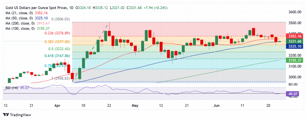 Giá vàng (XAU/USD) tiếp tục đà phục hồi từ cuối phiên thứ Ba sang sáng thứ Tư, khi đồng USD bắt đầu mất đà tăng và tâm lý rủi ro trở lại với thông tin lệnh ngừng bắn giữa Iran và Israel. Sau ba phiên giảm liên tiếp, vàng đã bật lên từ đáy 2 tuần tại 3.295 USD/oz và hiện đang hướng tới ngưỡng kháng cự 3.350 USD.