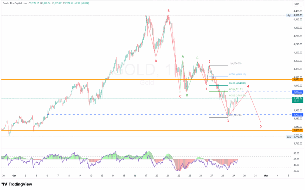 Về mặt kỹ thuật, giá vàng đã chững lại tại mức Fibonacci 61,8% – vùng hỗ trợ then chốt trong chu kỳ điều chỉnh gần đây – và bật tăng trở lại hướng tới mục tiêu 4.010 USD/oz, với kháng cự tiếp theo tại 4.070 USD. Mô hình sóng hiện tại cho thấy khả năng xuất hiện một nhịp điều chỉnh nhỏ về vùng 3.900 – 3.825 USD/oz trước khi xu hướng tăng trung hạn được nối dài.