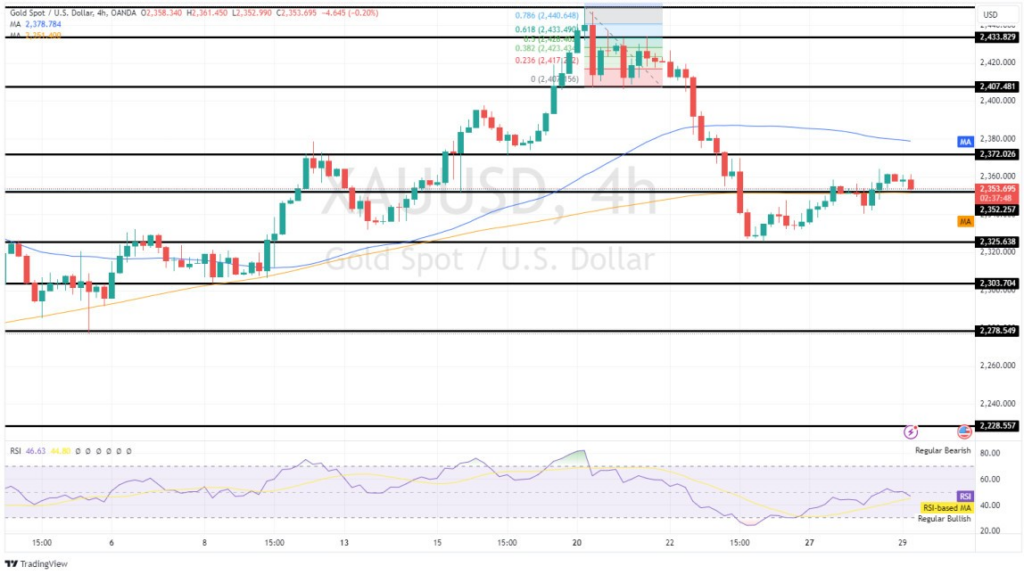 Thị trường đang diễn biến tích cực. Vàng đã vượt mức $2352 – tức là SMA 200 trên biểu đồ 4h. Đường giá là kháng cự trước hiện đã chuyển thành hỗ trợ.
