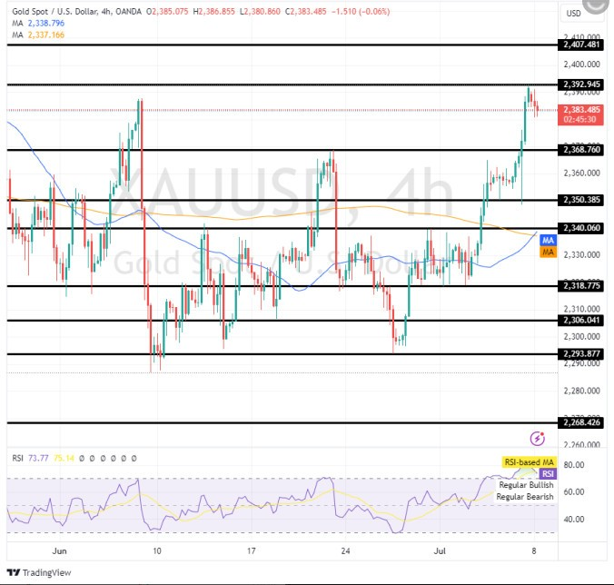 Vàng (XAU/USD) đã đạt mức cao nhất là $2392 vào thứ Sáu, một động thái khiến nó rơi vào tình trạng mua quá mức trên biểu đồ 4h.