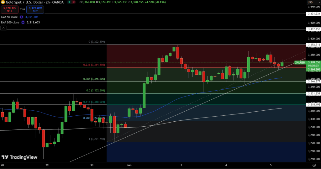 Vàng vẫn giữ cấu trúc tăng giá khi giao dịch trên các đường EMA chính. Nếu giá vượt qua $3392, xu hướng tăng có thể mở rộng đến vùng $3412 – $3431. Trong kịch bản tiêu cực, nếu mất vùng hỗ trợ $3346, khả năng điều chỉnh về $3332 có thể xảy ra. Tuy nhiên, xu hướng tổng thể vẫn nghiêng về tăng giá khi các tín hiệu kỹ thuật và yếu tố cơ bản đồng thuận.