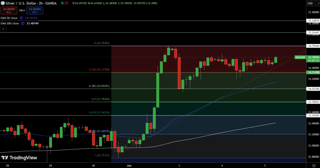 - Chiến lược mua (long): Mua quanh vùng $34,30–$34,50 nếu giữ trên đường xu hướng tăng.