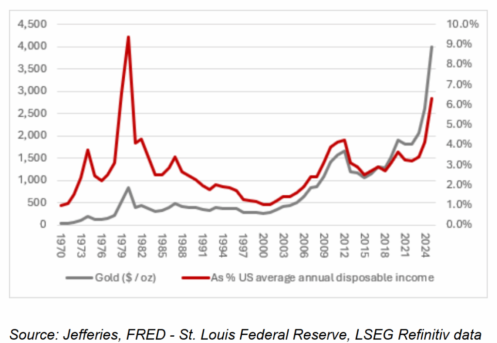 Theo AJ Bell, một chỉ số thú vị là sức mua vàng so với thu nhập hộ gia đình Mỹ: