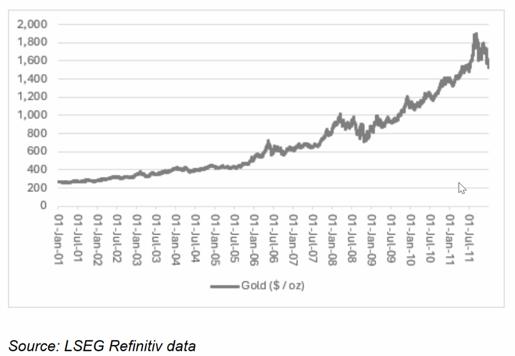 💰 Chu kỳ 2 (2001–2011): Vàng – nơi trú ẩn giữa khủng hoảng tài chính