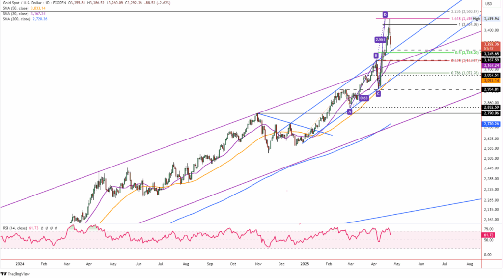 - Vàng đã giảm từ đỉnh $3,500 xuống mức thấp trong ngày tại $3,260 – đây là mức thấp nhất trong 4 phiên giao dịch gần nhất, đồng thời phá vỡ đáy của phiên thứ Ba. Động thái này xác nhận mô hình nến “shooting star” và tạo ra tín hiệu đảo chiều trong ngắn hạn.
