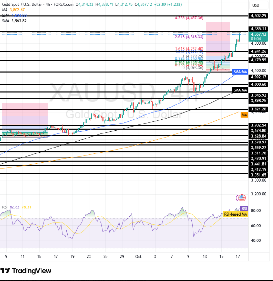 Giá vàng thế giới vừa lập đỉnh lịch sử mới, tiếp tục bứt phá nhờ lợi suất trái phiếu Mỹ giảm sâu và làn sóng đầu cơ mạnh mẽ. Theo phân tích kỹ thuật, vàng đã chạm mức cao nhất tại 4.385 USD/ounce, và đang hướng tới mục tiêu kế tiếp là 4.457 USD, tương ứng với mức mở rộng Fibonacci 423,6% của vùng 4.092 – 4.179 USD. Mốc tâm lý 4.500 USD/ounce được xem là kháng cự mạnh tiếp theo, trong khi vùng 4.241 – 4.179 USD đóng vai trò hỗ trợ quan trọng.