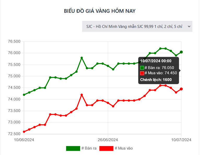 Nhẫn SJC 9999 niêm yết giao dịch mua – bán tại 74,45 – 76,05 triệu đồng/lượng – tăng 150 nghìn mỗi chiều mua và bán so với chốt phiên 9/7.