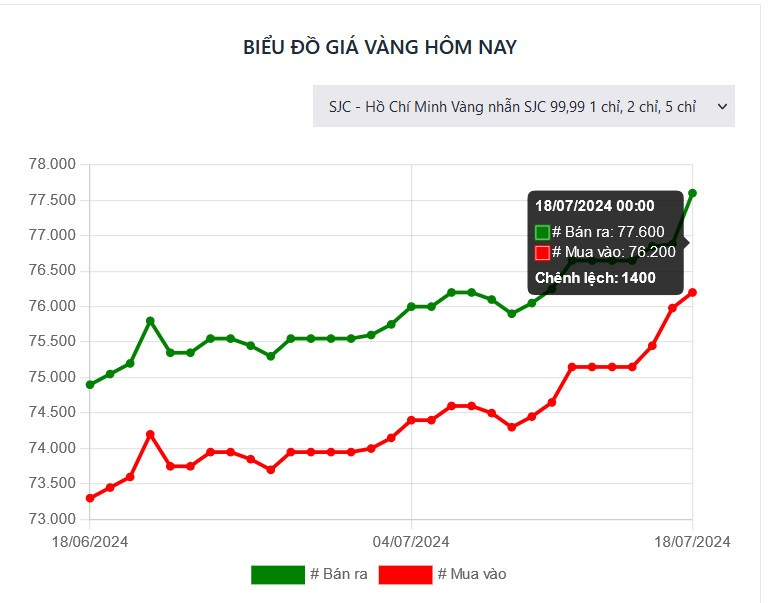 Nhẫn SJC 9999 niêm yết giao dịch mua – bán tại 76,2 – 77,6 triệu đồng/lượng – tăng 220 nghìn chiều mua nhưng tăng tới 720 nghìn chiều bán ra so với cuối ngày 17/7.